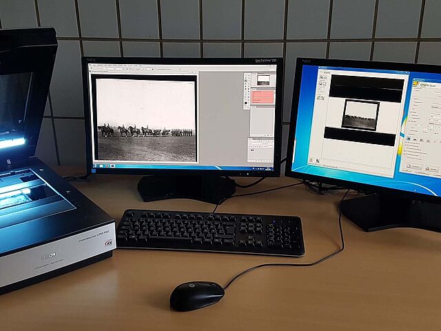 Um die schonende Bearbeitung der Originale zu ermöglichen, werden als erstes Digitalisate hergestellt. In Absprache mit dem für die Bildüberlieferungen zuständigem Referat (Bildarchiv) werden die zu restaurierenden Glasnegative nach deren Vorgaben hinsichtlich Bildtyp, Auflösung, Größe, Signatur und Dateityp in der Fotorestaurierung im ersten Schritt als Sicherheitskopie eingescannt und auf ein Laufwerk, zugänglich für die Mitarbeiter der Fotorestaurierung und des Bildarchivs, abgespeichert.
