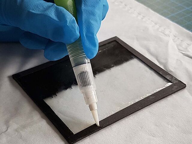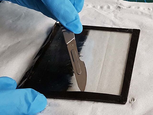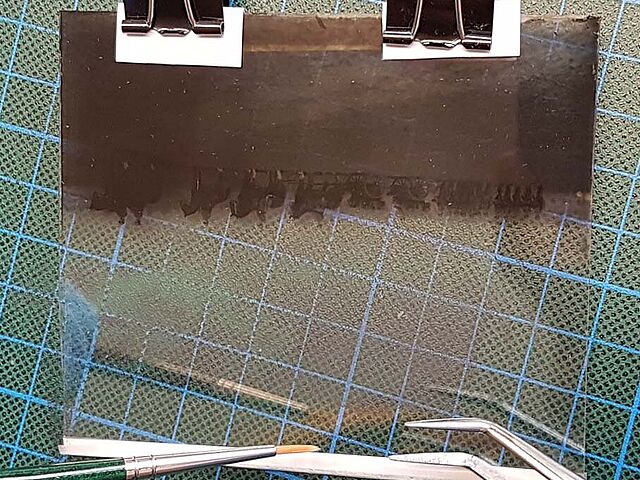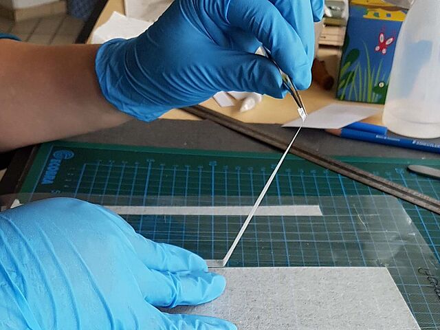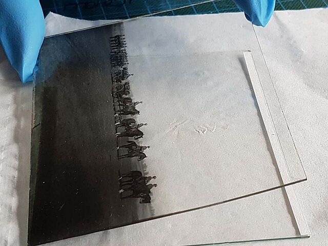 Nun beginnt die eigentliche Restaurierung. Dazu werden bei Vorlagen, die mit einer zweiten Glasplatte verstärkt sind, diese zunächst entfernt. Grundsätzlich erfolgt bei allen Originalen eine Reinigung, entweder trocken oder im Nassverfahren mit Wasser bzw. Alkohol. Danach wird je nach Bedarf die abgelöste Gelatineschicht mit Paraloid befestigt. Gebrochene oder gerissene Vorlagen werden mit einer zweiten Glasplatte stabilisiert.