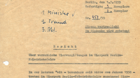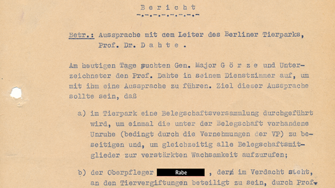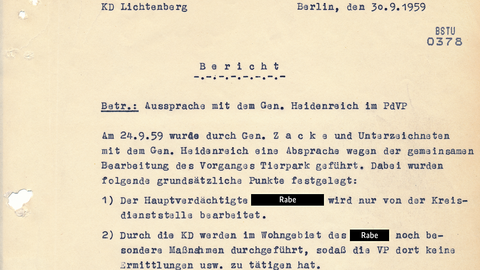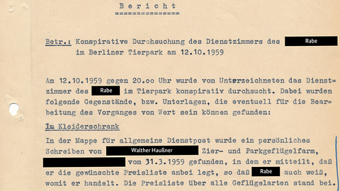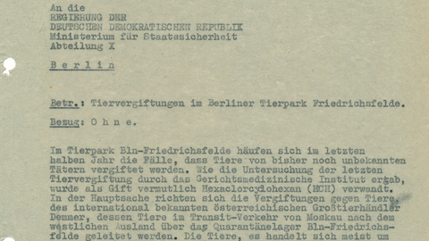 Die Ermittlungen fielen in den Zuständigkeitsbereich der MfSMinisterium für StaatssicherheitDas Ministerium für Staatssicherheit (umgangssprachlich oft kurz "Stasi") war politische...-Kreisdienststelle (KDKreisdienststelleDie KD waren neben den Objektdienststellen die territorial zuständigen Diensteinheiten. Sie waren...) Lichtenberg, die sich direkt neben dem Tierpark befand. Das MfS koordinierte sein Vorgehen eng mit der Abteilung VE (Volkseigentum) im Präsidium der Volkspolizei. Wie ein im Stasi-Unterlagen-Archiv überlieferter Bericht zu einer Besprechung zwischen MfS und Volkspolizei (VP) zeigt, hatte die Geheimpolizei dabei das Sagen.