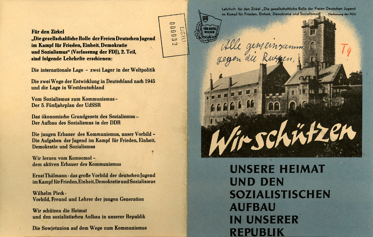 ![Beschriftete Broschüre Für den Zirkel "Die gesellschaftliche Rolle der Freien Deutschen Jugend im Kampf für Frieden, Einheit, Demokratie und Sozialismus" (Verfassung der FDJ), 2. Teil, sind folgende Lehrhefte erschienen: Die internationale Lage - zwei Lager in der Weltpolitik Die zwei Wege der Entwicklung in Deutschland nach 1945 und die Lage in Westdeutschland Vom Sozialismus zum Kommunismus - Der 5. Fünfjahrplan der UdSSR Das ökonomische Grundgesetz des Sozialismus - Der Aufbau des Sozialismus in der DDR Die jungen Erbauer des Kommunismus, unser Vorbild - Die Aufgaben der Jugend im Kampf für Frieden, Einheit, Demokratie und Sozialismus Wir lernen vom Komsomol - dem aktiven Erbauer des Kommunismus Ernst Thälmann - das große Vorbild der deutschen Jugend im Kampf für Frieden, Einheit, Demokratie und Sozialismus Wilhelm Pieck - Vorbild, Freund und Lehrer der jungen Generation Wir schützen die Heimat und den sozialistischen Aufbau in unserer Republik Die Sowjetunion auf dem Wege zum Kommunismus Lehrheft für den Zirkel "Die gesellschaftliche Rolle der Freien Deutschen Jugend im Kampf für Frieden, Einheit, Demokratie und Sozialismus" (Verfassung der FDJ) [Bild: Eine Fotoaufnahme von der "Wartburg". Die Aufnahme wurde mit dem handschriftlichen Schriftzug "Alle gemeinsam gegen die Russen." nachträglich von einem Unbekannten versehen.] Unsere Heimat und den sozialistischen Aufbau in unserer Republik](/assets/stasi-mediathek/f/5/csm_MfS_BV-Schwerin_AU_Nr-72-53_Bl-032_244115657f.png)