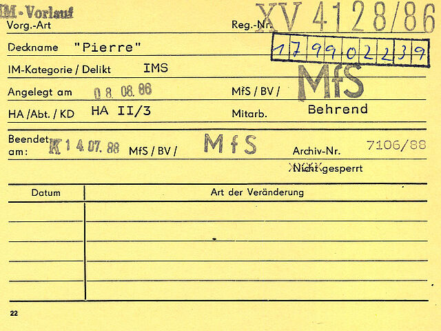 - Karteibezeichnung: Zentrale VorgangskarteiF 22Aus Gründen der MfS-internen Konspiration wurde - räumlich getrennt von der Personenkartei F 16 -... "F 22F 22Aus Gründen der MfS-internen Konspiration wurde - räumlich getrennt von der Personenkartei F 16 -..."