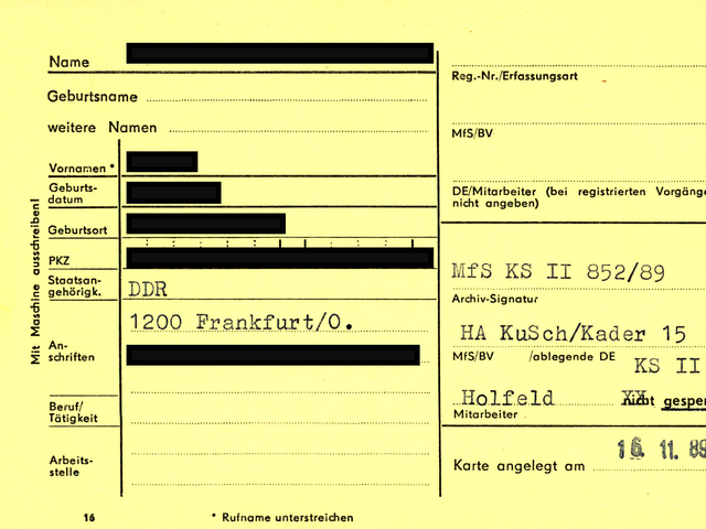 Zu sehen ist eine gelbe Karteikarte des Typs "Formblatt 16". Das MfS vermerkte auf der linken Seite personenbezogene Daten wie Klarname, Geburtsdaten und PKZ. Zusätzlich wurde noch die Anschrift vermerkt - ausgelassen sind die berufliche Tätigkeit und die Arbeitsstelle.Auf der rechten Seite wurden Registriernummer, zuständige Diensteinheit und Mitarbeiter ausgelassen. Aufgetragen hingegen sind die Archiv-Signatur sowie die Ablegende HA KuSch/Kader 15 und der zuständige Mitarbeiter. Auch der Hinweis, dass die Akte gesperrt abgelegt wurde, ist hier zu entnehmen. Das Anlegedatum der Karteikarte ist der 16.11.89Quelle: BArch, MfS, HA KuSch, Nr. 21900