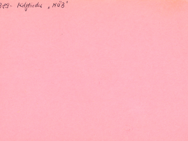 Zu sehen ist eine rosa Karteikarte des Typs "Formblatt 401", verwendet als Vorverdichtungs-, Such- und Hinweiskarte der Hauptabteilung XIX, Abteilung 1. Das MfS vermerkte auf der linken Seite personenbezogene Daten wie Klarname, Geburtsdaten und PKZ. Die Anschrift war ebenso wie die berufliche Tätigkeit und die Arbeitsstelle erfasst.Auf der rechten Seite wurden weitere Hinweise auf bereits erfasste Informationsträger wie bspw. auf die Dokumentennummer, Parteiinformation und/oder bereits archivierten Unterlagen sowie durch Schlagworte begründete Querverweise vermerkt (hier RdF).Quelle: BArch, MfS, HAXIX, Nr. 9452