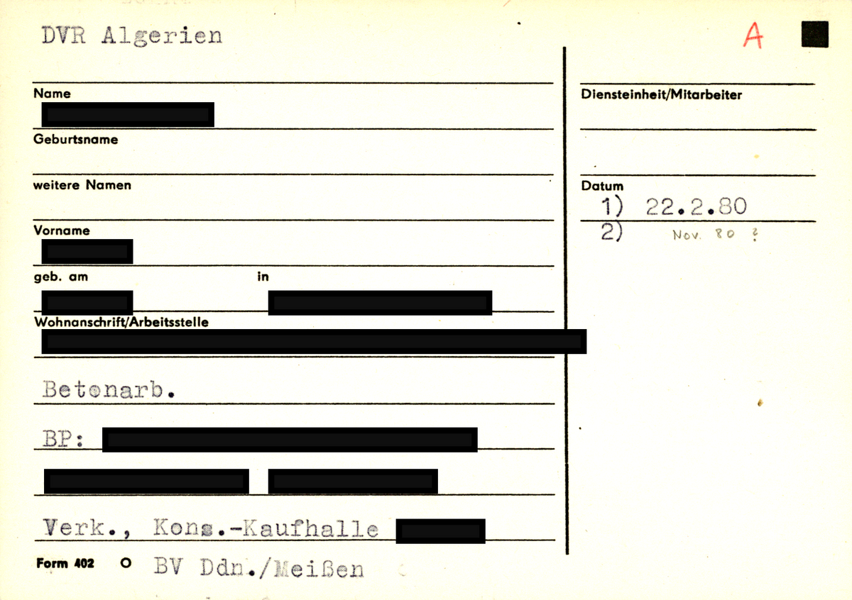 Das Beispiel zeigt eine Karteikarte zu einem algerischen Bürger, welcher einen Antrag auf ständige Wohnsitznahme in der DDR gestellt hatte, um mit einer DDR-Bürgerin zusammenleben zu können. Sie ist als Bezugsperson (BP) auf der Karteikarte aufgeführt. Bei personenbezogenen Anfragen an das Bundesarchiv wird die vorgestellte Kartei in die Recherche einbezogen. Bei einem Recherchefund wird dies dem Antragsteller mitgeteilt.