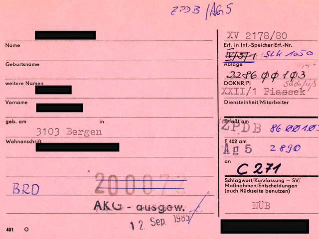 Zu sehen ist eine rosa Karteikarte des Typs "Formblatt 401", hier verwendet als VSH der AKG der Hauptabteilung XXII. Das MfS vermerkte auf der linken Seite personenbezogene Daten wie Klarname, Geburtsdaten und PKZ. Die Anschrift war ebenso wie die berufliche Tätigkeit und die Arbeitsstelle erfasst.Auf der rechten Seite wurden weitere Hinweise auf bereits erfasste Informationsträger wie bspw. auf die Dokumentennummer, Parteiinformation und/oder bereits archivierten Unterlagen sowie durch Schlagworte begründete Querverweise vermerkt.Quelle: BArch, MFS, HAXXII, Nr. 21241