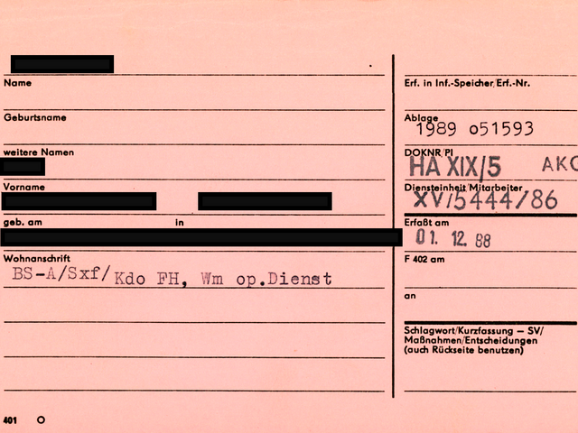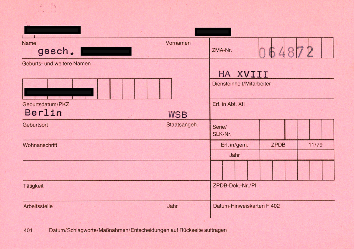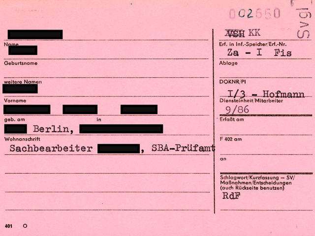Eine rosa Karteikarte des Typs "Formblatt 401", hier genutzt als VSH der Hauptabteilung XIX, Abteilung 5. Das MfS vermerkte auf der linken Seite personenbezogene Daten wie Klarname, Geburtsdaten und PKZ. Die Anschrift war ebenso wie die berufliche Tätigkeit und die Arbeitsstelle erfasst.Auf der rechten Seite wurden weitere Hinweise auf bereits erfasste Informationsträger wie bspw. auf die Dokumentennummer, Parteiinformation und/oder bereits archivierten Unterlagen sowie durch Schlagworte begründete Querverweise vermerkt.Quelle: BArch, MfS, HAXIX, Nr. 9451