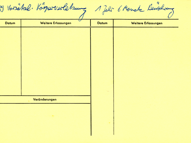 Die Vorderseite der Karteikarte enthält auf der oberen Hälfte die Rubriken für interne Angaben, wie