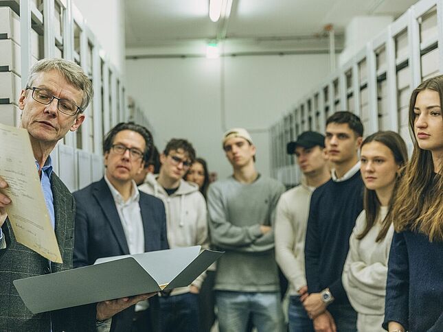 Zum Abschluss einer mehrmonatigen Recherche zu einem Wehrmachtsoffizier hat ein Oberstufen-Geschichtskurs des Kölner Apostel-Gymnasiums das Bundesarchiv besucht. Am Standort Berlin-Lichterfelde schauten sich die Schülerinnen und Schüler gemeinsam mit Bundesarchiv-Vizepräsidentin Andrea Hänger verschiedene Bereiche des Archivs an.