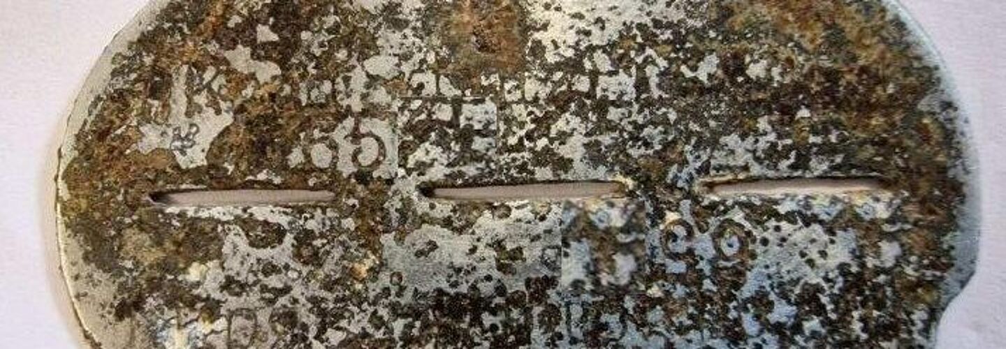 Die Inschrift der Erkennungsmarke ist kaum lesbar, das kennen wir im Bundesarchiv von vielen übermittelten Marken aus Gräbern. Immerhin ließ sich die persönliche Nummer auf der Marke eindeutig entziffern. Außerdem haben wir Teile der Inschrift zur Wehrmachts-Einheit dechiffrieren können: Krad.Schütz.Ers.Bat.