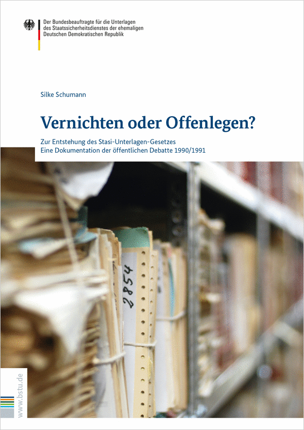 Die vorliegende Dokumentation zeichnet den kontroversen Verlauf dieser Diskussion nach, von den Anfängen im Dezember 1989, als die Bürgerkomitees Kreis- und Bezirksämter des Staatssicherheitsdienstes besetzten, bis zur Verabschiedung des Stasi-Unterlagen-Gesetzes. Sie konzentriert sich dabei vor allem auf Meinungsäußerungen, die in der Presse veröffentlicht wurden. Des Weiteren sind diejenigen Gesetzentwürfe und Gesetzestexte abgedruckt, die die Grundlage der Debatte bildeten. Auch dreißig Jahre nach dem Beginn dieser Debatte sind die Darstellung von Silke Schumann und die dokumentierten Quellen immer noch lesenswert. Die Vorgeschichte des Stasi-Unterlagen-Gesetzes und die wechselvollen Anfänge des Aufarbeitungsprozesses werden durch die vorliegende Neuauflage anschaulich beleuchtet.