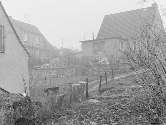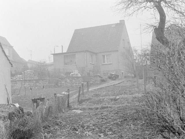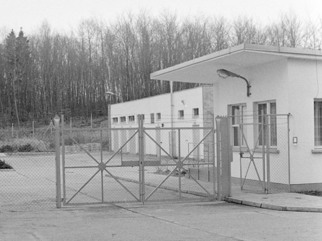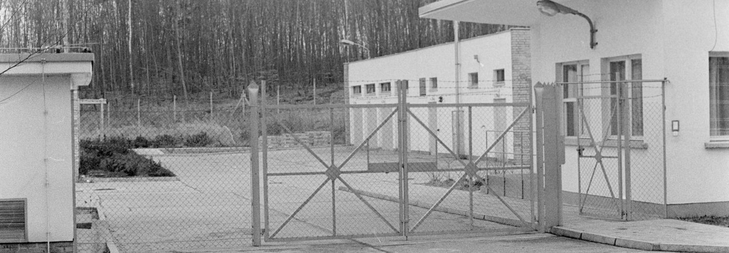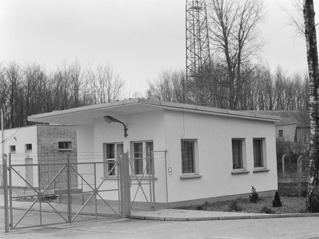 ![Eingezäunter Gebäudekomplex in ländlicher Gegend [Den Bildmittelpunkt des schwarz-weißen Lichtbilds zeigt die verschlossene Einfahrt des umzäunten Geländes. Der WEg zum Bungalow ist durch Beton geebenet. Im Hintergrund ist ein Funkmast erkennbar.]](/assets/stasi-mediathek/1/4/csm_MfS_HA-XX_Fo_Nr-81-Bild-021_ae0e1604d2.png)