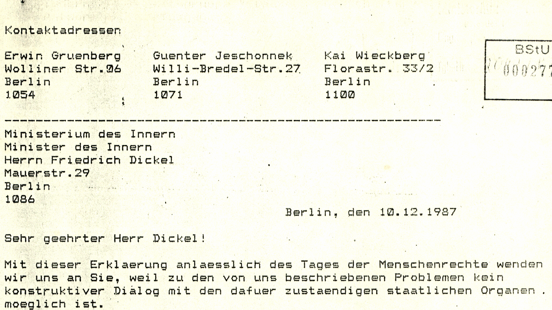 Einige davon waren seit September 1987 in der Arbeitsgruppe "Staatsbürgerschaftsrecht der DDR", der ersten Selbsthilfegruppe von Ausreisewilligen in der DDR, organisiert. Sie hatte am 10. Dezember 1987 mit einer Erklärung zum Tag der Menschenrechte auf sich aufmerksam gemacht. Seitdem verstärkte die Stasi ihr Vorgehen gegen Ausreisewillige.