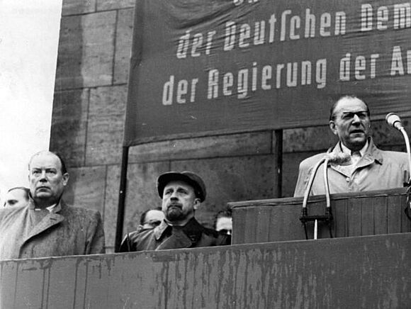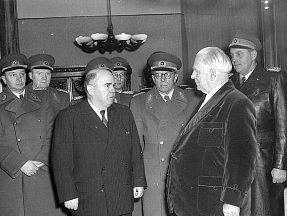 ![Ernst Wollweber In der Wohnung des DDR-Präsidenten Wilhelm Pieck steht eine Delegation von Gratulanten: Polizei, Kasernierte Volkspolizei, Ministeriums des Innern und Ministeriums für Staatssicherheit überbringen dem Präsidenten Glückwünsche. Der Minister für Staatssicherheit Ernst Wollweber (Bildmitte) spricht im Namen der Delegation. Von rechts nach links: Generalmajor Dollwetzel, Generalleutnant Vincenz Müller, Generalmajor Friedrich Dickel, Generalmajor Walter, Generalmajor [Hermann] Gartmann, Generalmajor Last, Chefinspekteur Hentschel und Chefinspekteur Seifert.](/assets/bundesarchiv/de/_processed_/c/2/csm_volksaufstand_rolle-mfs_Bundesarchiv-Bild-183-35339-0011T2_b688acfd49.jpg)