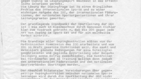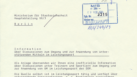 Eine Information der HAHauptabteilungOrganisationsstruktur in der MfS-Zentrale, die durch den Minister oder einen seiner Stellvertreter... XX/3 zur Doping-Problematik im Leistungssport der DDR vom 23.05.1989 geht auf die weltweiten Konsequenzen nach den Doping-Überführungen von Seoul ein. Der Berichterstatter des MfSMinisterium für StaatssicherheitDas Ministerium für Staatssicherheit (umgangssprachlich oft kurz "Stasi") war politische... mutmaßt über zukünftige internationale und nationale Dopingkontrollen. Die Information hält als offiziellen Position fest: "Der grundlegende Standpunkt der Sportleitung der DDR ist […] daß die DDR gegen jede Art von Doping im Sport ist und für ein weltweites Verbot eintritt."
