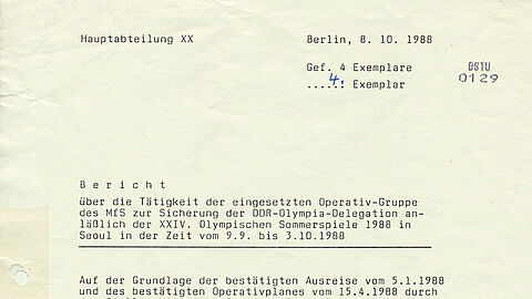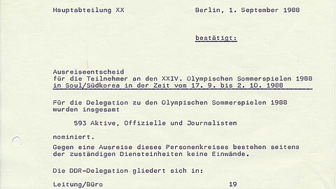 Der DDR Olympia-Mannschaft gehörten 593 Sportler, offizielle Vertreter und Journalisten an. Für die Absicherung der DDR-Olympia-Delegation war das Ministerium für StaatssicherheitMinisterium für StaatssicherheitDas Ministerium für Staatssicherheit (umgangssprachlich oft kurz "Stasi") war politische... zuständig. Es bildete dafür eine OperativgruppeOperativgruppe1. Das MfS unterhielt ständige Niederlassungen in der Sowjetunion (seit 1951), Bulgarien (1961),..., die in einem Abschlussbericht ihre Aktivitäten bilanzierte. Insgesamt waren in Seoul 98 Inoffizielle Mitarbeiter für die Staatssicherheit im Einsatz. Sportler, die als IMInoffizieller MitarbeiterInoffizielle Mitarbeiter waren das wichtigste Instrument des Ministeriums für Staatssicherheit... verpflichtet waren, wurden nicht eingesetzt, da sie sich während der Spiele auf ihre athletischen Leistungen konzentrieren sollten.
