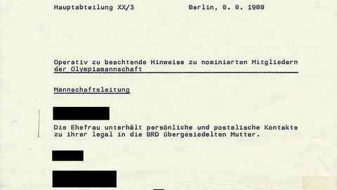 Im Dokument steht, dass seit Anfang 1989, unterstützende Mittel im Juniorenbereich zum Teil keine Anwendung mehr finden. Im Hochleistungssportbereich sei die Verabreichung um 50 Prozent zurückgenommen worden, jedoch gäbe es 600 Sportler "mit bestätigten Programmen", also Sportler, die Dopingmittel nehmen. Besonders brisant sei dabei, so die HauptabteilungHauptabteilungOrganisationsstruktur in der MfS-Zentrale, die durch den Minister oder einen seiner Stellvertreter... XX/3, dass bei internationalen Kontrollen während des Trainings positive Testergebnisse nicht ausgeschlossen sein könnten.