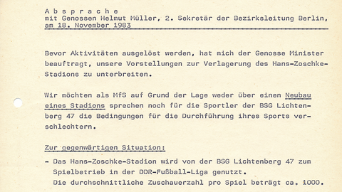 Protokoll einer Absprache zwischen MfS und Bezirksleitung Berlin zur Verlagerung des Hans-Zoschke-Stadions