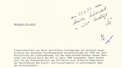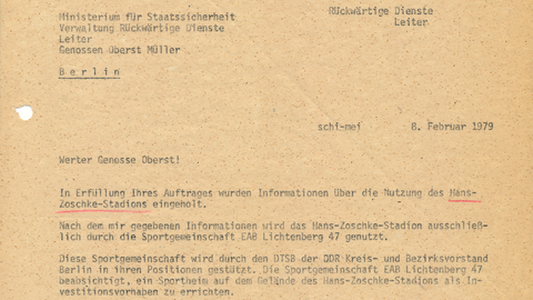 In einem Schreiben an Minister Erich Mielke beschrieb Generalmajor Günther Müller der VRD den aktuellen Stand der Übernahme des Hans-Zoschke-Stadions.