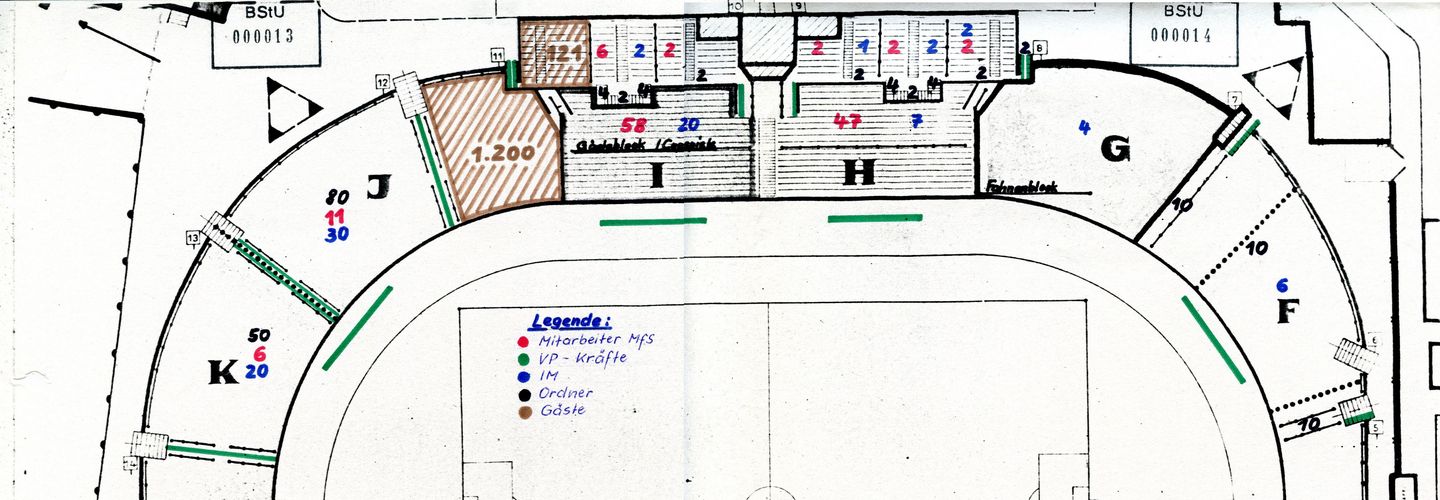 Das Dokument zum "Kräfteeinsatz zum EC (Europacup)-Rückspiel am 19.4.1989" listet genau auf, wie die Stasi plante, Ordnung und Sicherheit während des Europacup-Spieles zu gewährleisten und Protestaktionen zu verhindern. Kritik am SED-Staat, so die Logik der Stasi, könne das Ansehen der DDR im Ausland beschädigen. So wurden im Stadion gezielt u. a. Inoffizielle Mitarbeiter (IM) platziert, die konkrete Hinweise zum "Herauslösen von Störern" geben sollten.