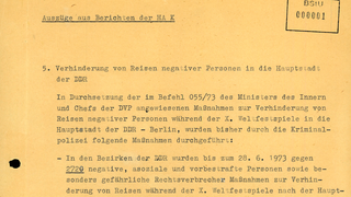 Information der Kriminalpolizei zu verhinderten Reisen "negativer Personen" zu den X. Weltfestspielen der Jugend
