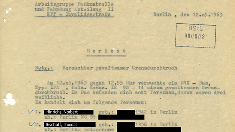 Am Mittag des 12. Mai 1963 säumte ein Menschenauflauf das Gelände um den Grenzübergang Invalidenstraße in Berlin. Östlich der Mauer versammelten sich Grenztruppen der Nationalen Volksarmee (NVA) um einen beschädigten BVG-Bus. Auf West-Berliner Seite beobachteten Augenzeugen das Geschehen.