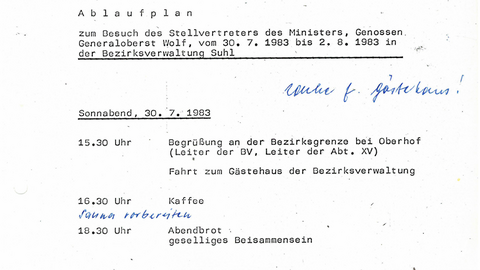 Die Planungen für den Kurzbesuch Wolfs begannen im Juni 1983. Am Anfang stand ein erster Austausch zwischen der HV A und der Abteilung XV der BVBezirksverwaltungIm Zusammenhang mit der Verwaltungsreform der DDR vom Sommer 1952 wurden die fünf... Suhl bzw. der Leitung der BV Suhl. Wolf, der sich zu dieser Zeit noch im Urlaub befand, ließ sich kurze Zeit später die Programmpunkte vorlegen und bestätigte diese persönlich.