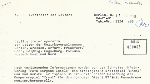 1988 landete eine Zoll-Information über das Einfuhrverbot für das verbotene Computerspiel "Kreml" in den Unterlagen der für Postkontrolle zuständigen MfS-Abteilung M.