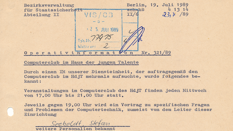 Im Juli 1989 sammelte ein inoffizieller Mitarbeiter des MfS Informationen über die Mitglieder, Hard- und Software im Ost-Berliner Computerclub.