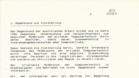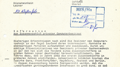 Die Mitte der 80er Jahre einsetzende private Nutzung von Heimcomputern beschäftigte ab 1986 verstärkt auch die Stasi. Die Geheimpolizei wollte wissen, was die jungen Menschen mit ihren Geräten anstellten. Dafür nahm sie verschiedene "operative" Aspekte in den Blick: die Kontakte von Computerfans in den Westen, die Gefahr von Virenübertragungen auf DDR-Rechner in Betrieben und staatlichen Stellen, den Schmuggel von Computertechnik und die Einfuhr von Software mit verbotenen Inhalten. Dazu zählten etwa Spiele mit "antisozialistischem Charakter", d. h. NS-Bezügen oder kriegsverherrlichenden Darstellungen.