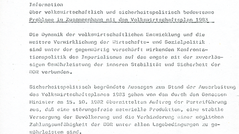 1982/83 spitzte sich die Lage so zu, dass die DDR drohte, unmittelbar vor der Zahlungsunfähigkeit zu stehen. Die Hauptabteilung XVIIIHauptabteilung XVIIINach dem Vorbild der "Verwaltung für Wirtschaft" in der sowjetischen Hauptverwaltung für... (HA XVIII) warnte Stasi-Minister Mielke vor der drohenden Zahlungsunfähigkeit, nicht realisierbaren Plänen und "Selbsttäuschungen".