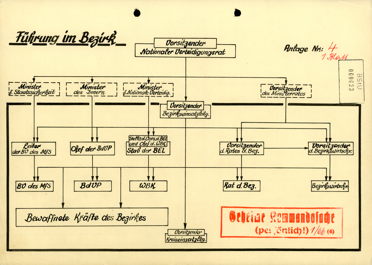 Die im "Vorbeugekomplex" geplanten Isolierungslager waren nach einem Kennziffernsystem in die gesamtstaatliche "Mobilmachungsarbeit" eingebettet, mit der sich das SED-Regime auf den Ernstfall vorbereitete. Die letztendliche Befehlsgewalt lag beim Vorsitzenden des Nationalen Verteidigungsrates der DDR, das heisst seit 1971 bei Erich Honecker.