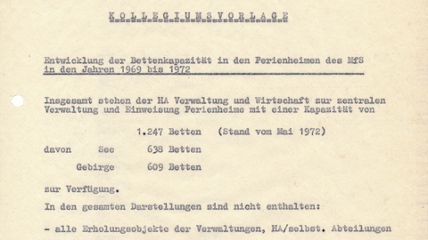 Wie aus einem Dokument der HauptabteilungHauptabteilungOrganisationsstruktur in der MfS-Zentrale, die durch den Minister oder einen seiner Stellvertreter... "VerwaltungVerwaltung1. Organisationsstruktur des MfS für Aufgabenkomplexe, die in der Zentralstelle durch einen... und Wirtschaft", einer Vorgänger-Diensteinheit der VRD, aus dem Jahr 1972 hervorgeht, zählte das MfS 1968 16.600 Betten in allen Ferienheimen; vier Jahre später waren es bereits 23.677. Der höchste Bedarf, so eine Schlussfolgerung der Ferienplaner, konzentriere sich vor allem auf die Sommermonate Juli und August. Bis zum Ende des MfS gelang es, durch Ausbau beziehungsweise Neubau einzelner Objekte und durch ein effektiveres Vergabemanagement stetig die Urlaubskapazitäten innerhalb der Geheimpolizei zu erweitern.