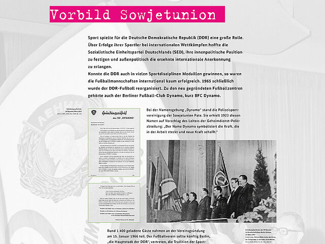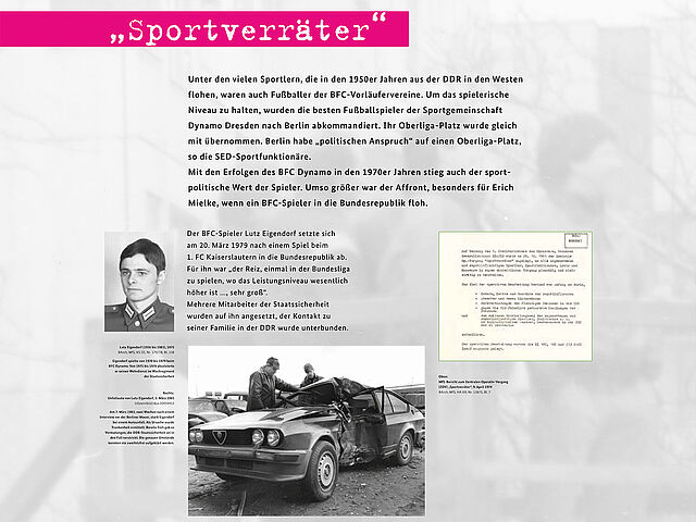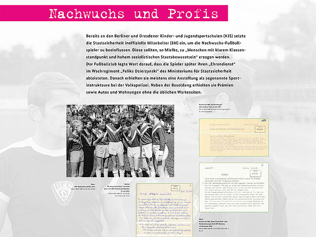 Die Ausstellung zeichnet den Einfluss der DDR-Geheimpolizei auf den Verein nach und macht sichtbar, wie der BFC und seine Fans von der Stasi überwacht und kontrolliert wurden.